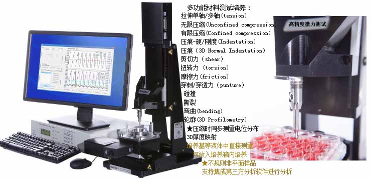 多功能生物組織材料壓縮、張力、剪切、摩擦、扭轉(zhuǎn)、超軟或硬材料壓痕mapping(剛度、硬度、3D法向量壓痕)、穿刺、撕裂、頂出推擠、膨脹收縮、彎曲、懸臂折曲、爆破機(jī)械特性一體化的測試分析與培養(yǎng)裝置。限滿足各種材料的多種力學(xué)性能的測量表征及評估。