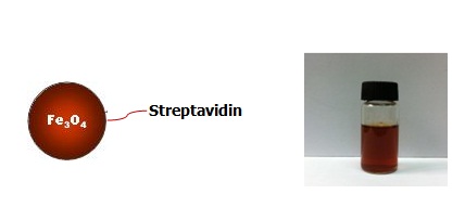 The surface of the supperparamagnetic Fe3O4 nanoparticles is covalently functionalized with streptavidin, can be used to bind biotin-conjugated molecules, such as antibody, protein, peptide, DNA primers, etc., through high affinity interaction between streptavidin and biotin.
