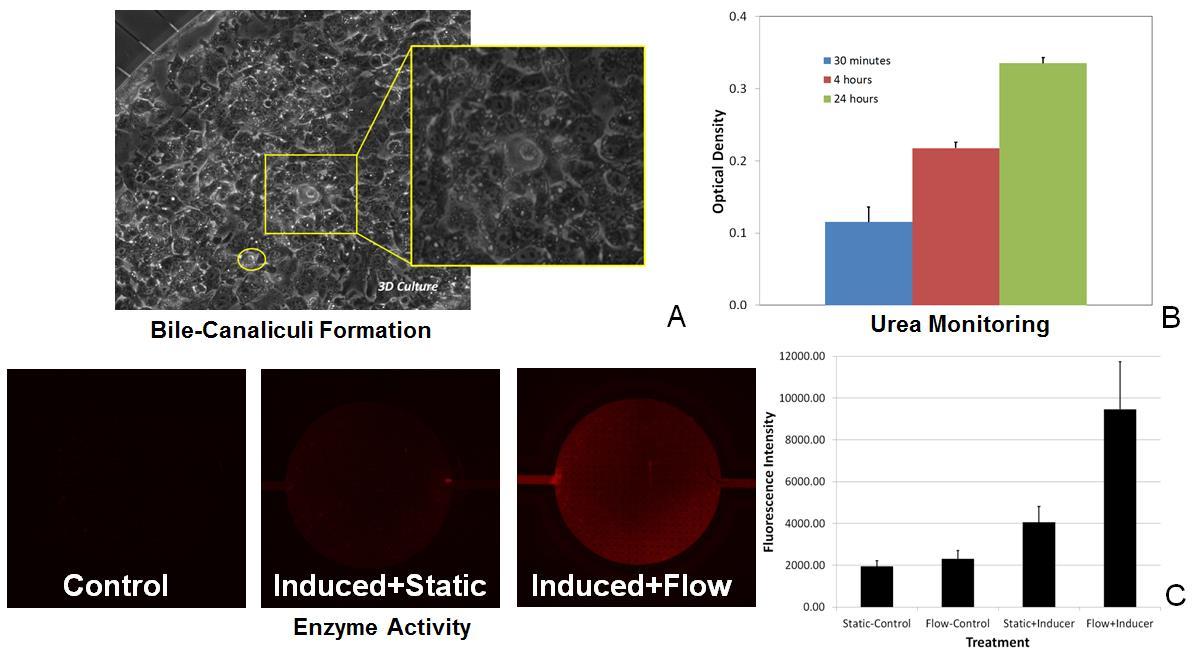 肝細(xì)胞形成膽小管(圖A),以時間依賴性方式分泌尿素,產(chǎn)量增加(圖B),并可以實時監(jiān)測其酶活性(圖C)。 隨著酶活性的增加,可以清楚地觀察到血流對肝細(xì)胞的影響。