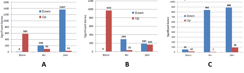 基因組反應(yīng)突出了內(nèi)皮細(xì)胞(圖A),肝細(xì)胞(圖B)和心肌細(xì)胞(圖C)中上調(diào)和下調(diào)的細(xì)胞