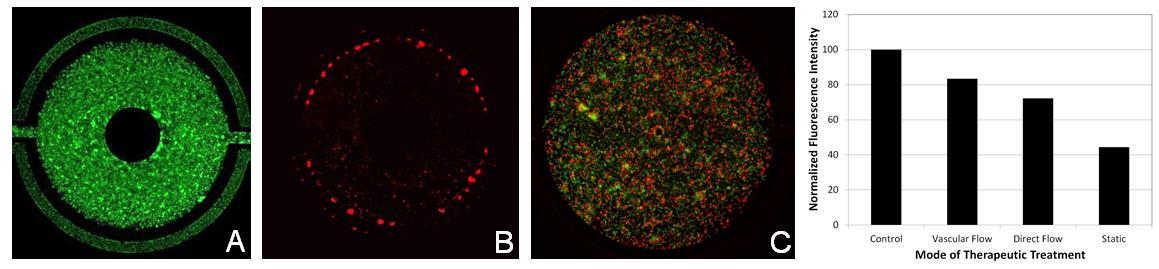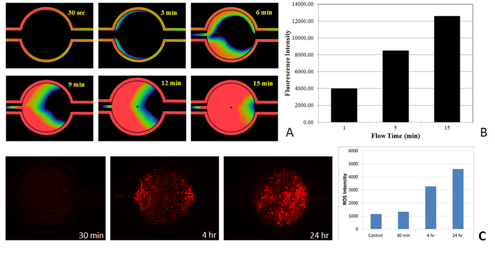 實時監(jiān)測藥物擴散和時間依賴性毒性。 藥物通過內(nèi)皮組織界面擴散(圖A)。 化療后凋亡細(xì)胞的時間依賴性增加(圖B)。 ROS強度隨時間的增加表明化療后的毒性(圖C)。