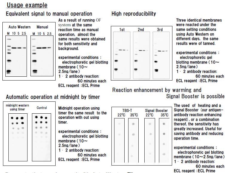 該自動免疫印跡試驗系統(tǒng)是用于進行膜的抗體反應(yīng)以進行Western印跡的自動儀器。 抗體反應(yīng)過程通常需要5個小時,使用Auto Western可以節(jié)省研究人員的勞力并減少錯誤。 此外,夜間使用該自動免疫印跡試驗系統(tǒng)可以j大地提高實驗效率。