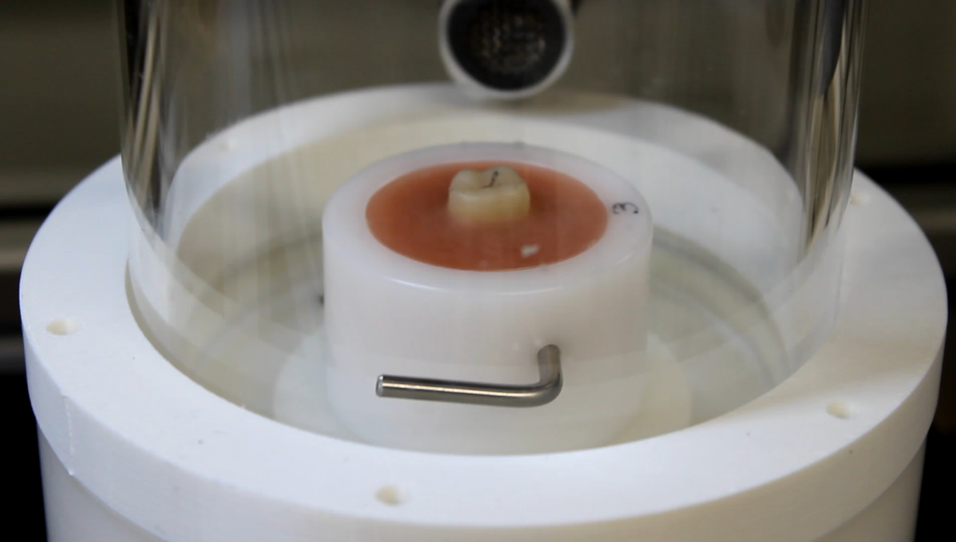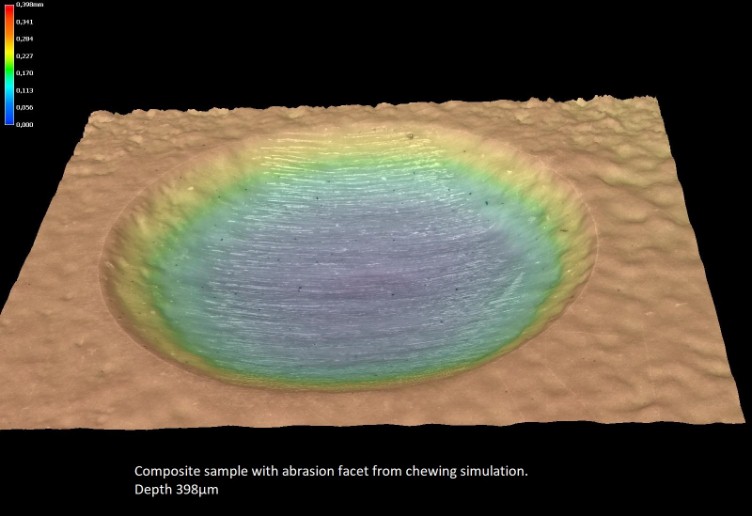 在Voco Structur 2 SC扁平試樣上,使用四個(gè)不銹鋼圓錐體和四個(gè)硬質(zhì)合金圓錐體作為拮抗劑。在蒸餾水中,以50N進(jìn)行240,000個(gè)在咀嚼模擬循環(huán)后(相當(dāng)于體外約1年),測(cè)量硬度,磨損量以及大深度。
