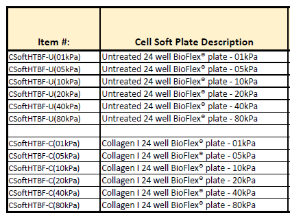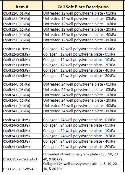 CellSoft培養(yǎng)板有很多不同的種類,如不同的硬度(彈性模量范圍1-80kPa),可用于顯微觀察的腔室載玻片(圓形多孔板),共價包被Collagen I或其他蛋白,可對細胞進行靜態(tài)或動態(tài)牽拉應力刺激。更重要的一點,新型的CellSoft™ 培養(yǎng)板可以反復胰酶消化和再接種細胞,蛋白包被的表面可以重復使用多達三次