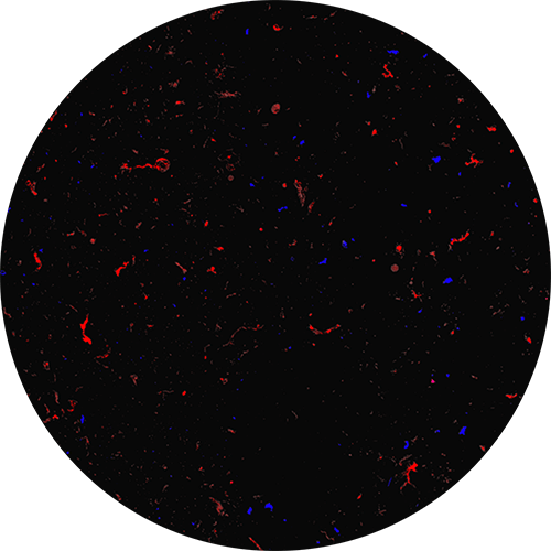 在來自Aura的組合明場(非蛋白質(zhì),藍(lán)色)和熒光(蛋白質(zhì),紅色)圖像中,在AAV2旋轉(zhuǎn)樣品中觀察到的衣殼聚集非常少,非蛋白質(zhì)聚集較少。