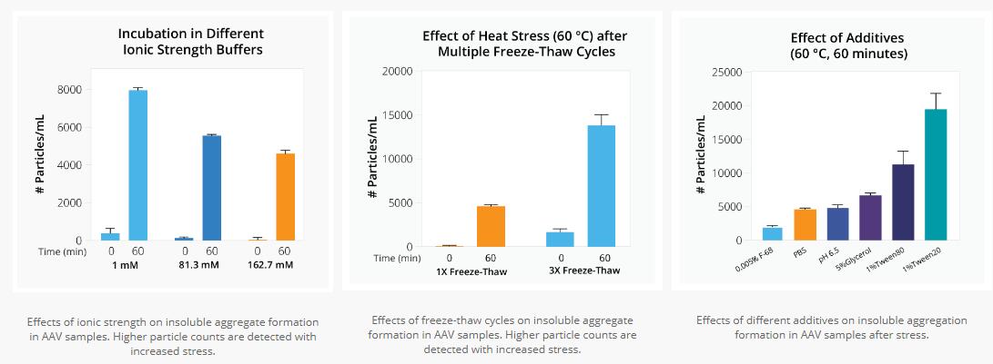 離子強度對AAV樣品中不溶性聚集體形成的影響。隨著應(yīng)力的增加,可以檢測到更高的顆粒數(shù)。