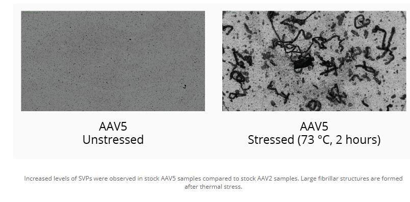 與庫存AAV2樣品相比,在庫存AAV5樣品中觀察到SVP含量增加。熱應(yīng)力后形成大的原纖維結(jié)構(gòu)。