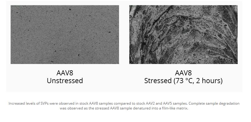 與庫存AAV2和AAV5樣品相比,在庫存AAV8樣品中觀察到SVP含量增加。隨著應(yīng)力的AAV8樣品變性成膜狀基質(zhì),觀察到樣品wanquan降解。