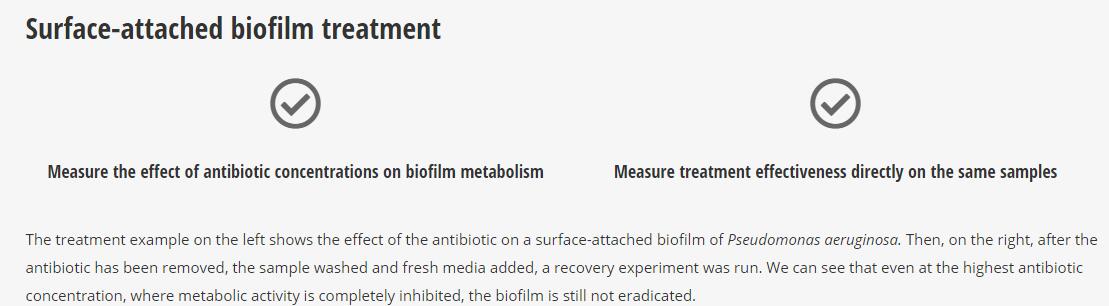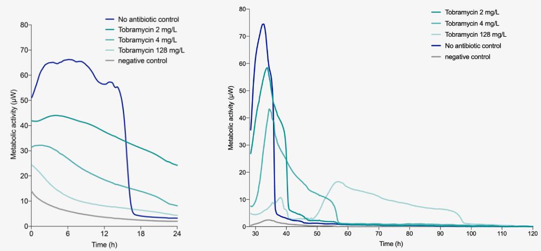 使用該系統(tǒng),您可以查看時間殺滅測定法中通常使用的cfu計(jì)數(shù)背后的數(shù)據(jù)。 如以下用美羅培南治療大腸桿菌所顯示的,我們可以很快看到隨著時間殺滅的前幾個小時新陳代謝減少而產(chǎn)生的抗菌素濃度的作用,可作為時間殺滅結(jié)果的預(yù)測指標(biāo)。 除此之外,該系統(tǒng)可以連續(xù)且實(shí)時地收集時間殺滅數(shù)據(jù),這意味著wu需費(fèi)時的重復(fù)采樣即可干擾您的實(shí)驗(yàn)。