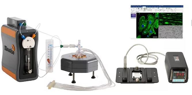 1.2、Cellix 的精密微流體 Mirus Evo 泵和 ExiGo 泵以恒定或可變的剪切應(yīng)力將細(xì)胞樣本或quan血輸送到 Vena8 Fluoro+ 或 Vena8 Endothelial+ 生物芯片的微毛細(xì)血管中。 這模擬了體內(nèi)生理剪切應(yīng)力。