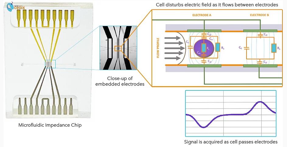 阻抗譜是一種通過(guò)在嵌入微流體芯片的兩個(gè)電ji之間施加電場(chǎng)來(lái)測(cè)量細(xì)胞或粒子的電阻和電容特性的方法。當(dāng)每個(gè)細(xì)胞流過(guò)電ji時(shí),電場(chǎng)受到干擾。