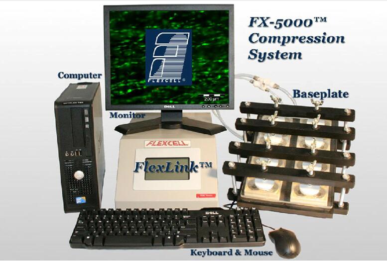 flexercell's® Compression System regulates posve air pressure to compress tissue samples or 3D cell cultures in vitro. The FX-5000C™ Compression System compresses samples between a piston and stationary platen using our BioPress® culture plates. It can load up to 14 lbs. of applied force. Using the FX-5000C™ Compression System, researchers can observe biochemical changes and cell signaling in vitro that mimics in vivo condons.