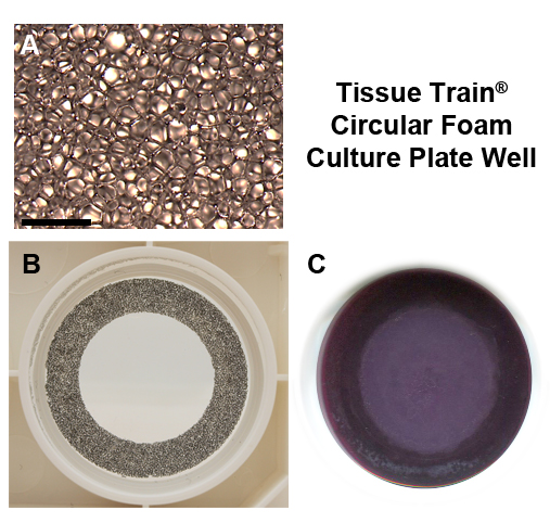 A) Close-up of open cell foam Bar = 1 mm B) Top view of a well in a 6-well Tissue Train® Circular Foam Culture Plate C) Top view of a well with Collagel® matrix solution attached to the foam ring.