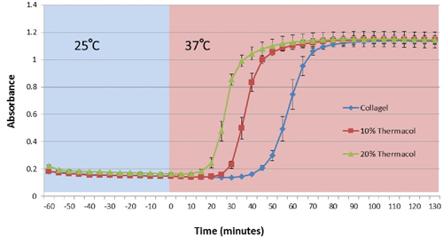 Speed of gelation of 3D cell-seeded constructs made with Collagel® and Thermacol®.