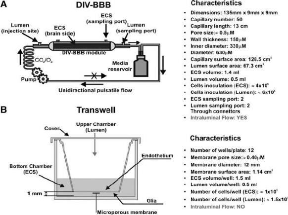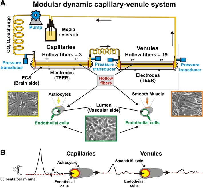 小靜脈節(jié)段(上圖) 腦血管生理學(xué)的研究對于了解神經(jīng)系統(tǒng)疾病的發(fā)病機(jī)制和藥物的藥代動(dòng)力學(xué)至關(guān)重要。適當(dāng)?shù)捏w外模型通常不能代表體內(nèi)生理學(xué)。為了解決這些問題,我們建議使用一種新的人工血管系統(tǒng),該系統(tǒng)密切模仿人類腦血管系統(tǒng)的毛細(xì)血管和靜脈段,同時(shí)還允許對實(shí)驗(yàn)變量及其操作進(jìn)行廣泛控制。 系統(tǒng)的中空纖維內(nèi)外側(cè)可以接種細(xì)胞,配套的心臟脈動(dòng)流泵以及跨膜電阻測量儀可用于體外仿真腦血管、毛血管各種血管模擬仿真等、 使用中空纖維技術(shù),我們修改了現(xiàn)有的血腦屏障 (BBB) (DIV-毛細(xì)血管) 動(dòng)態(tài)人工模型,以涵蓋腦循環(huán)系統(tǒng)的遠(yuǎn)端毛細(xì)血管后 (DIV-小靜脈) 段。該人工腦血管系統(tǒng)由串聯(lián)連接到小靜脈段的 BBB 模塊組成。泵產(chǎn)生脈動(dòng)流,動(dòng)脈壓力供給系統(tǒng)。毛細(xì)管模塊的灌注液達(dá)到與原位觀察到的水平相當(dāng)?shù)募羟袘?yīng)力、壓力和流速。內(nèi)皮細(xì)胞暴露于流動(dòng)和腔外星形膠質(zhì)細(xì)胞刺激允許形成具有與體內(nèi)相當(dāng)?shù)目鐑?nèi)皮電阻(TEER;> 700 ohm cm2)和蔗糖滲透性(< 1X10-u cm/sec)的高選擇性毛細(xì)血管 BBB .試圖重現(xiàn)小靜脈血流動(dòng)力學(xué)微環(huán)境特征的小靜脈模塊被介質(zhì)灌注,導(dǎo)致剪切應(yīng)力和管腔內(nèi)壓力水平低于毛細(xì)血管中的水平。由于細(xì)胞和血流動(dòng)力學(xué)因素的改變,小靜脈段的血管床比 BBB 的血管床更不嚴(yán)格(TEER <250 Ohm cm2;蔗糖 > 1X10-4 cm/sec)。外腔人腦血管平滑肌細(xì)胞用于復(fù)制小靜脈外腔細(xì)胞組成。