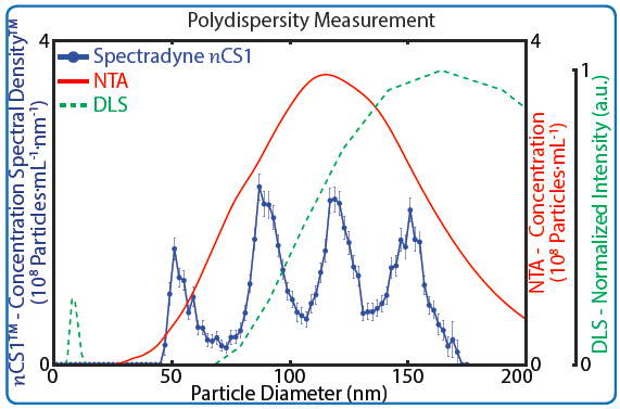 多分散顆?;旌衔锸侵附M成顆粒大小、形狀或分子量不同的混合物。這種混合物的粒度分布很難確定;混合物的大量光學特性,例如不透明度,并不能提供關于總體分布的詳細信息。當顆粒尺寸減小到亞微米范圍時,這一點尤其明顯。典型的表征儀器,如動態(tài)光散射(DLS)和光學粒子跟蹤不能分析高度多分散的混合粒子,而Spectradyne的nCS1可以。