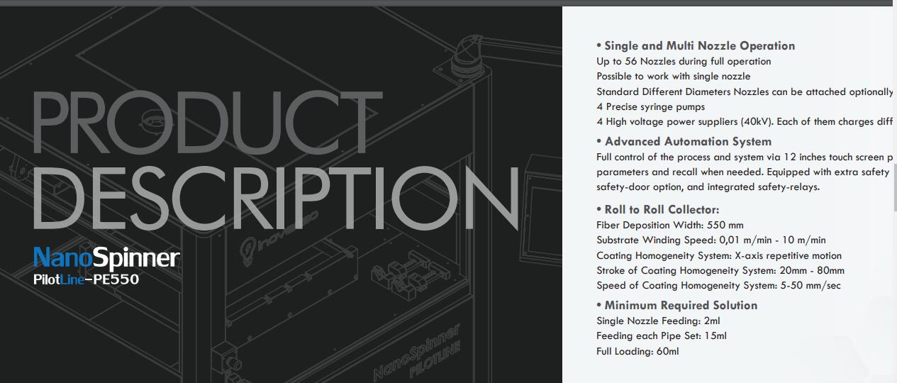 PE-550是我們zui暢銷的用于連續(xù)生產(chǎn)納米纖維的靜電紡絲設(shè)備,適用于工業(yè)規(guī)模的納米纖維生產(chǎn)。它的主要優(yōu)勢(shì)是可擴(kuò)展性,因?yàn)樗m用于生產(chǎn)線以及R&D項(xiàng)目。PE-550配有56個(gè)噴嘴,可實(shí)現(xiàn)大規(guī)模生產(chǎn)納米纖維的高生產(chǎn)率,但在R&D項(xiàng)目中,它也可配有1個(gè)噴嘴。